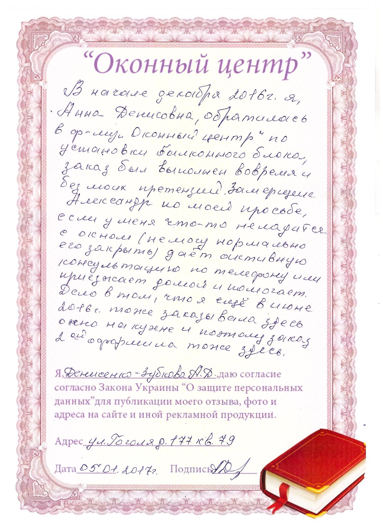 В начале декабря 2016 года я, Анна Денисовна ,обратилась в фирму «Оконный центр» по установке балконного блока. Заказ был выполнен вовремя и без моих претензий. Замерщик Александр по моей просьбе, если у меня что-то не ладится с окном (не могу нормально закрыть) дает активную консультацию по телефону или приезжает домой и помогает. Дело в том ,что я еще в июне 2016 года, тоже заказывала здесь окно на кухню и поэтому заказ второй оформила тоже здесь.