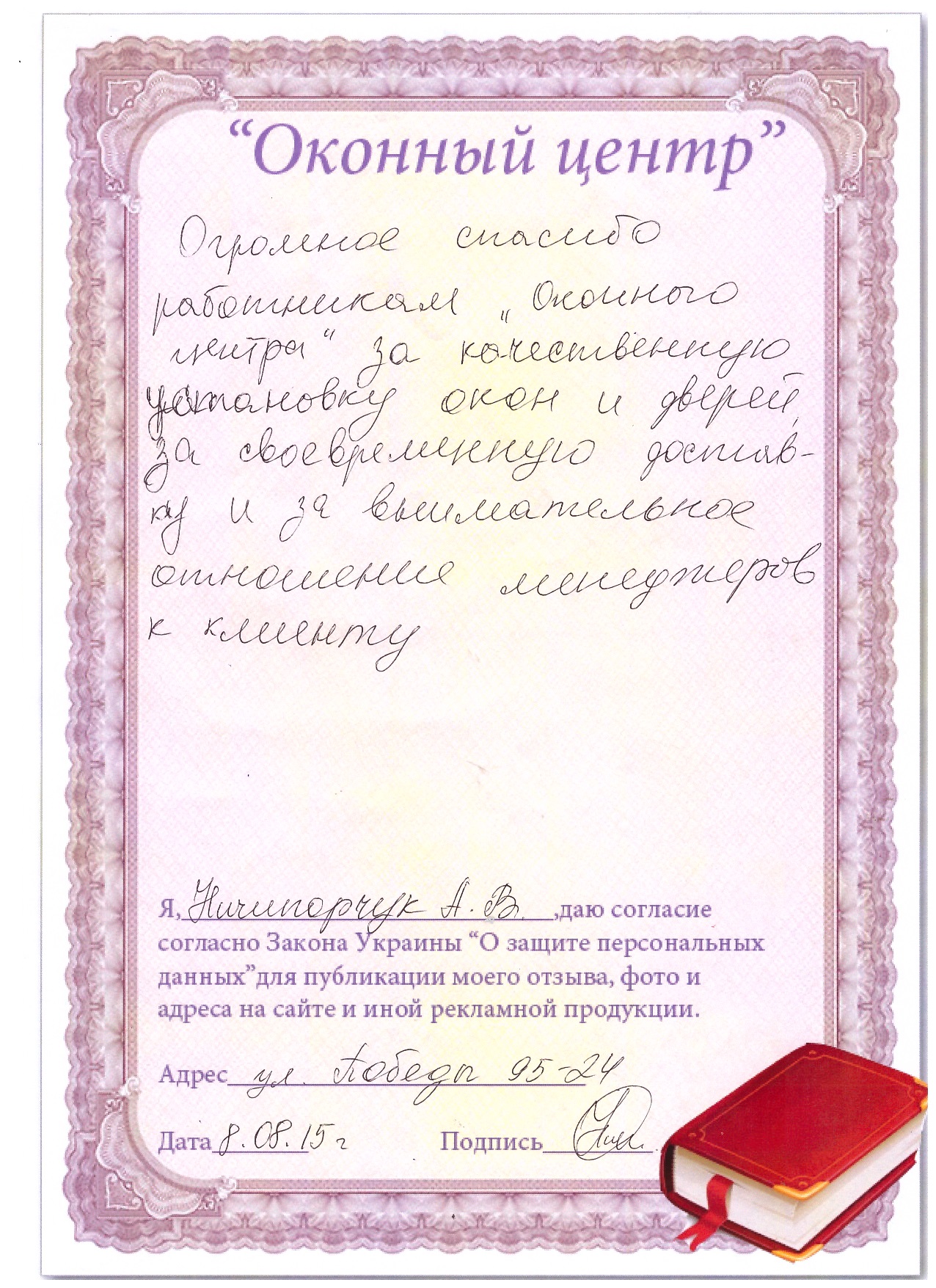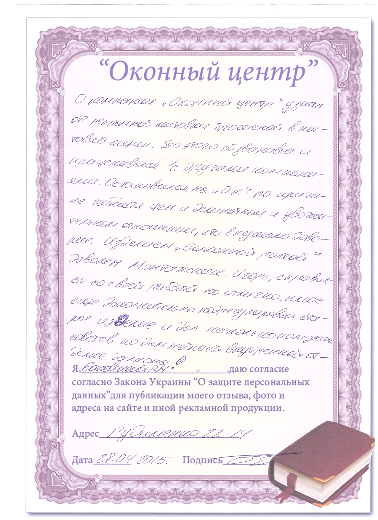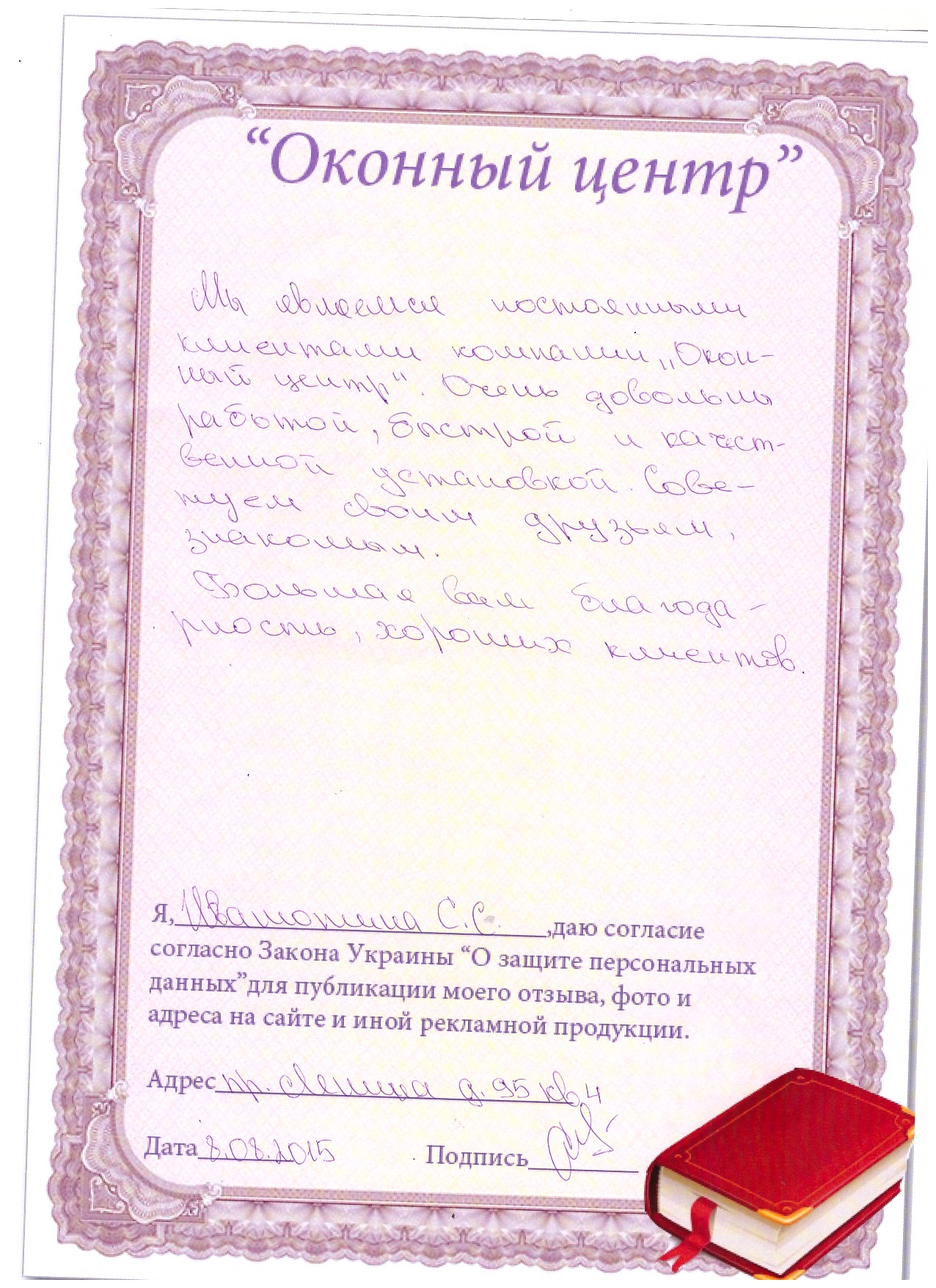 Я, Бокал Анатолий Дмитриевич, узнал по листовке о существовании фирмы, которая меняет окна (из старых деревянных) на металлопластиковые. Решил поменять одно, двухстворчатое окно. В процессе эксплуатации мне понравилось качество изделия, и я решил заменить 3хстворчатое окно. Жалоб и претензий на качество не имею. Благодарю, желаю успехов фирме.