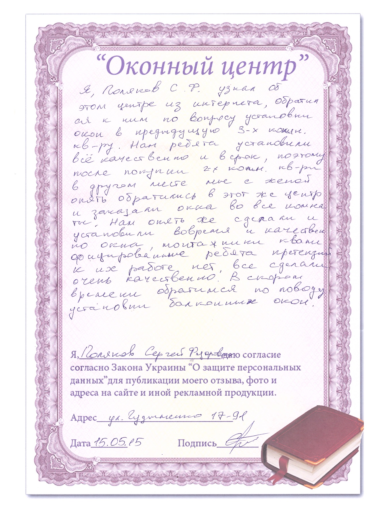 Я, Поляков С.Ф. узнал об этом центре из интернета, обратился к ним по вопросу установки окон в предыдущую 3-х комн. кв-ру. Нам ребята установили все качественно и в срок, поэтому после покупки 2-х комн.кв-ри в другом месте мы с женой опять обратились в этот же центр и заказали окна во все комнаты. Нам опять же сделали и установили вовремя и качественно окна, монтажники квалифицированные ребята претензий к их работе нет. Все сделали очень качественно. В скором времени обратимся по поводу установки балконных окон.
